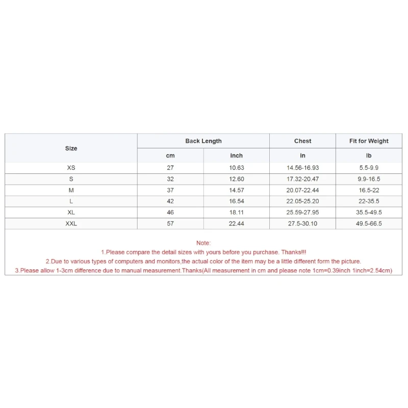 Size:XXL Back Length:57cm(22.44inch) Chest:27.5-30.10inFit for Weight:49.5-66.5lb